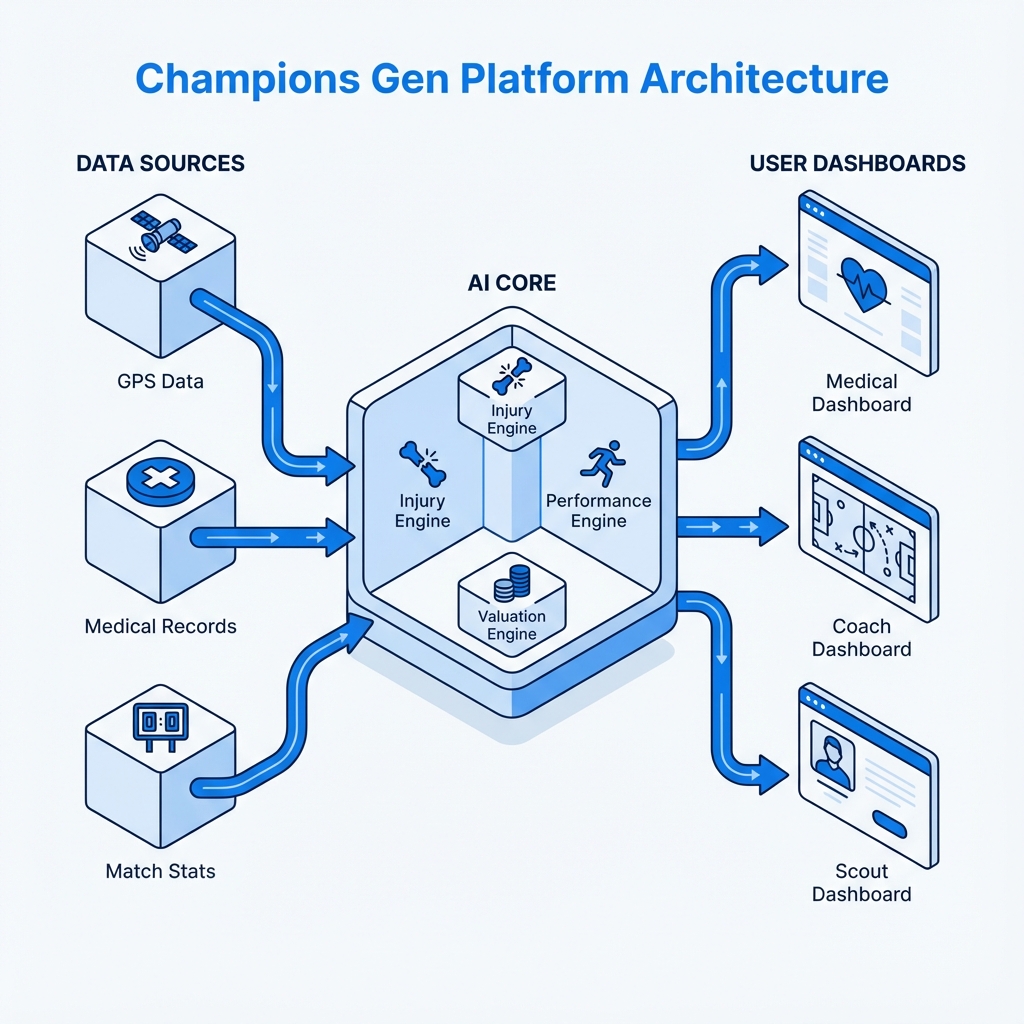 Champions Gen is a cutting-edge player intelligence platform designed to give professional clubs a competitive edge. By aggregating data from GPS wearables, medical records, and match statistics, it predicts injury risks before they happen and forecasts future player performance. It serves as a central nervous system for decision-making, from the physio room to the transfer market.