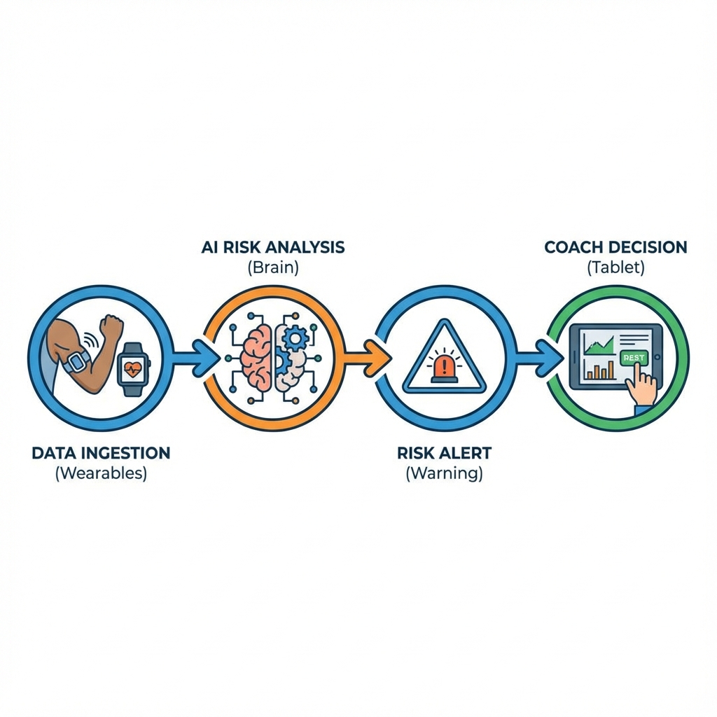 Data collection happens automatically via API integrations with wearable providers. The AI analyzes this stream in real-time. If a risk threshold is breached, an alert is pushed to the Medical Team's mobile app. Coaches review readiness reports before training, and Scouts use valuation projections during transfer windows.