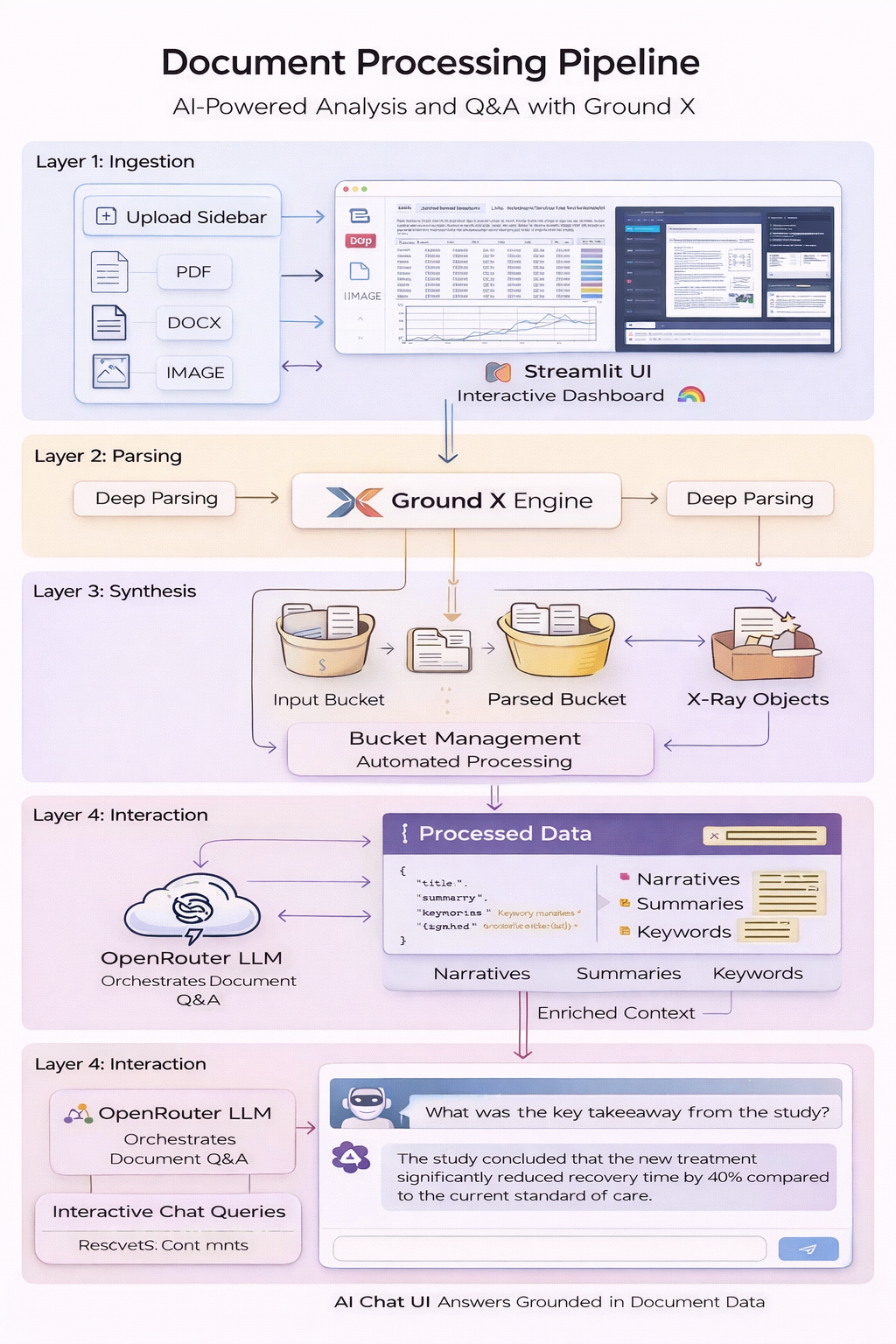 Ingestion: User uploads a PDF or image via the sidebar.\n2. Processing: Ground X performs deep parsing and X-Ray analysis.\n3. Synthesis: Narratives, summaries, and keywords are extracted.\n4. Interaction: User asks questions; LLM uses Ground X context to provide grounded answers.