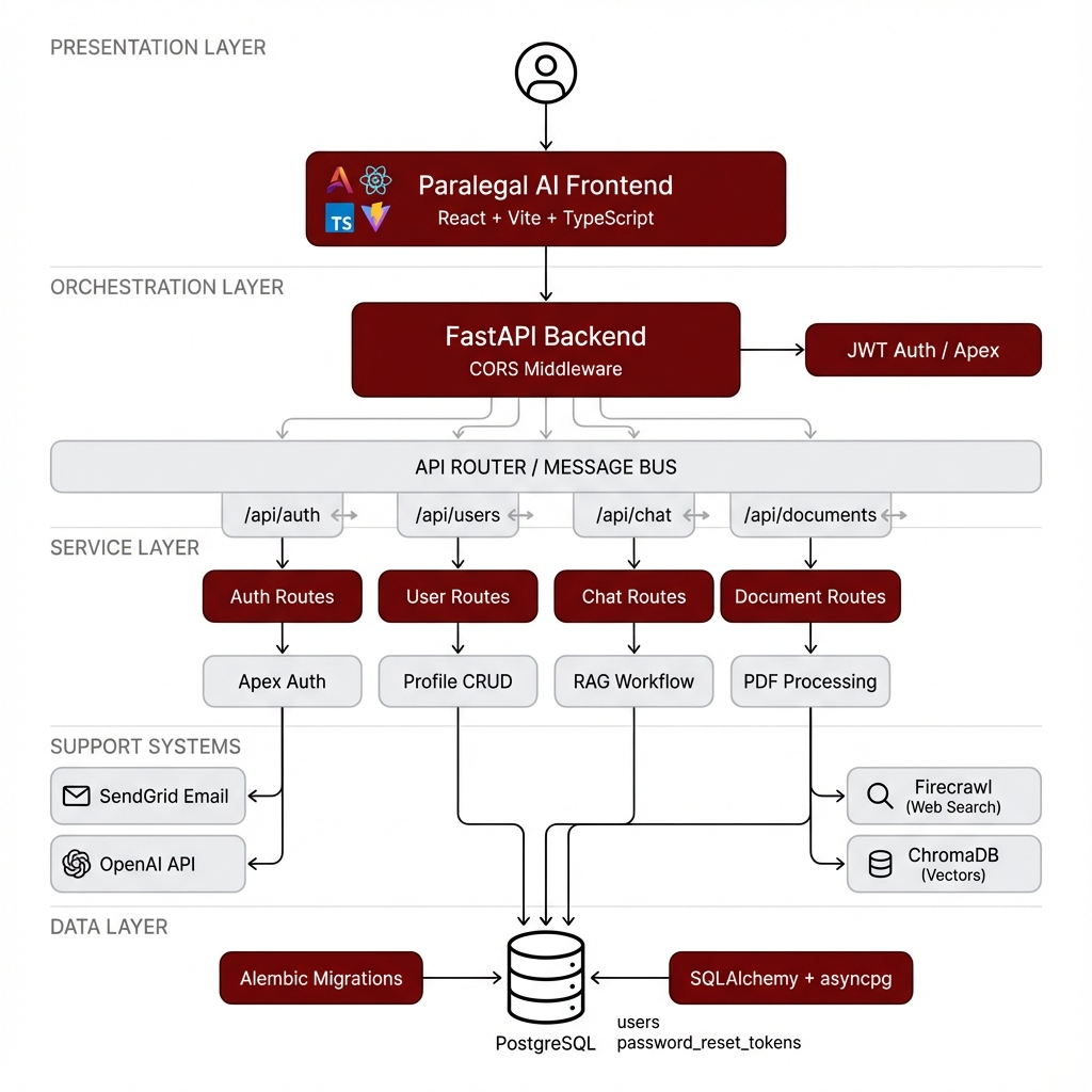 The system uses a layered architecture with React frontend, FastAPI backend with Apex SaaS Framework for authentication, and a RAG pipeline combining ChromaDB for vector storage, OpenAI for embeddings/LLM, and Firecrawl for web search fallback.