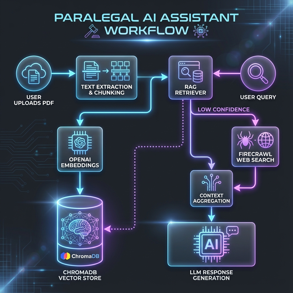 Legal professionals spend 60% of their time on document review and research. We built an AI assistant that ingests legal PDFs, chunks them intelligently, creates vector embeddings, and allows natural language queries. When documents don't have the answer, it seamlessly falls back to web search for case law and legal precedents.