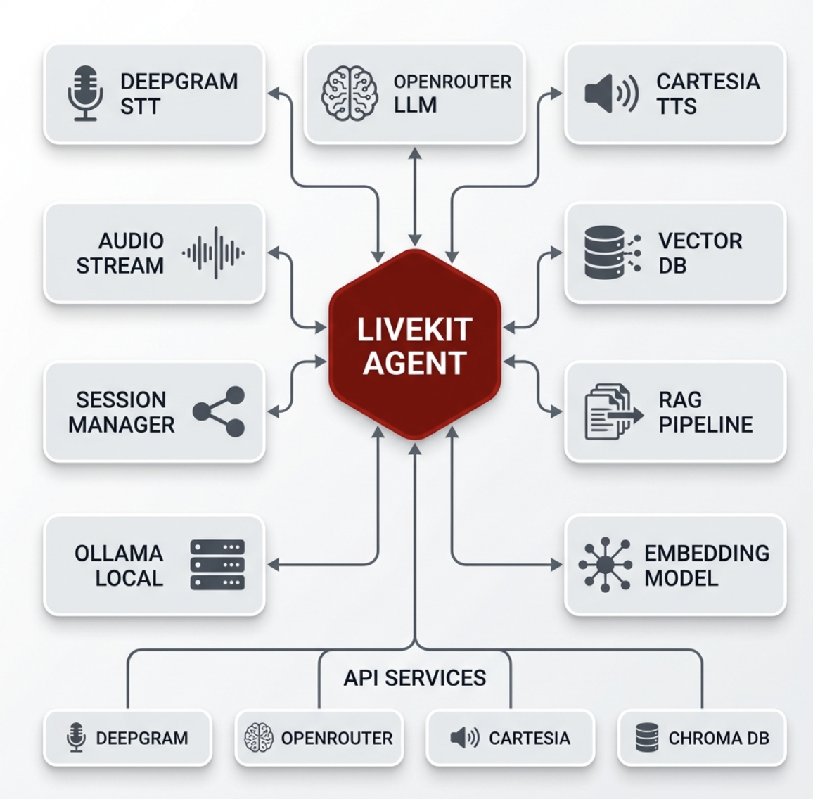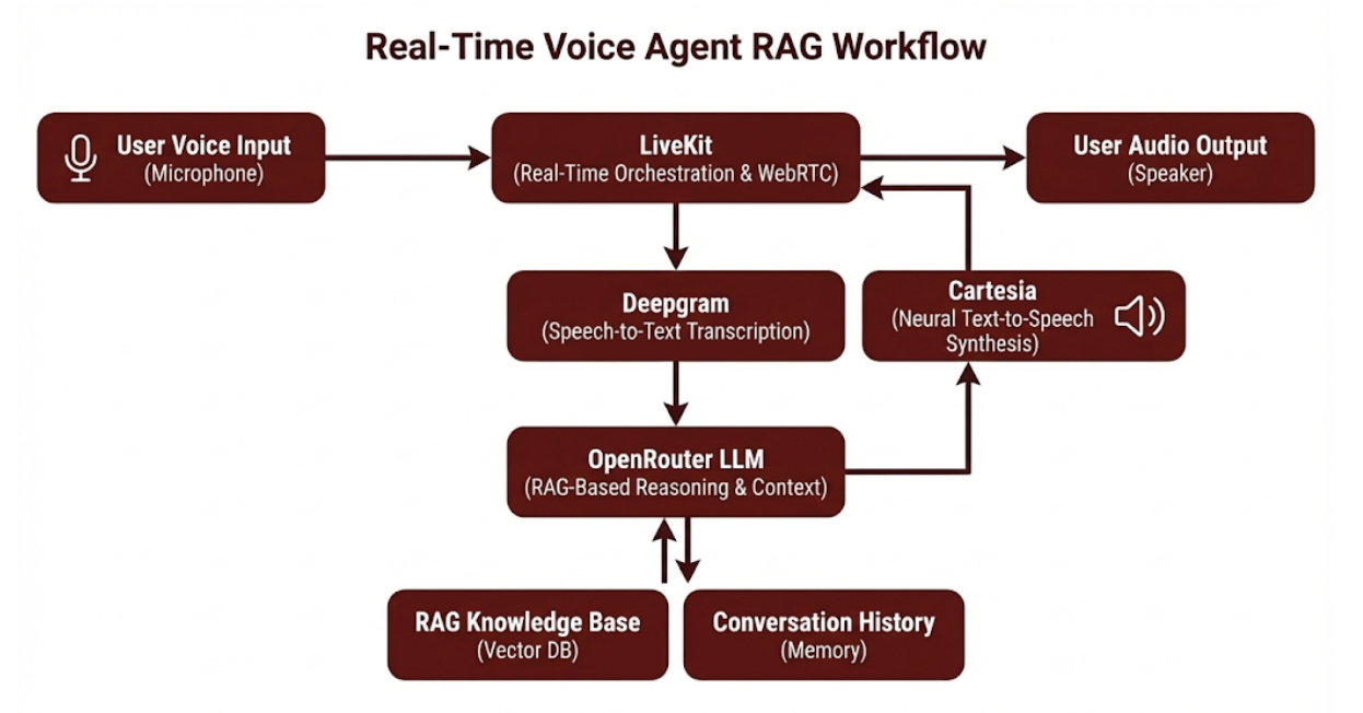 The system uses a modular RAG pipeline optimized for real-time audio. Speech input is captured and processed by Deepgram’s Speech-to-Text engine, then routed to an OpenRouter LLM for contextual reasoning. The response is synthesized using Cartesia’s neural voice model and streamed back via LiveKit. This bidirectional streaming pipeline ensures low-latency, natural dialogue flow.