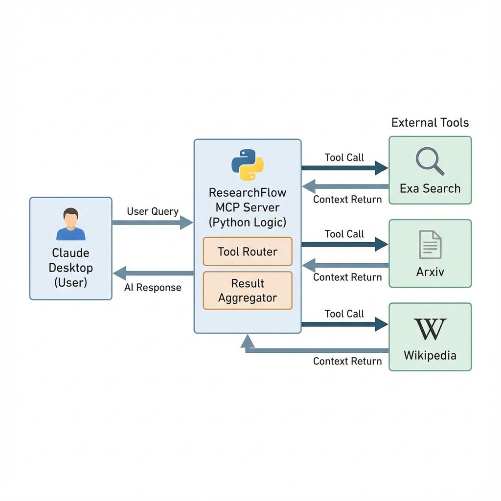 The ResearchFlow architecture places the MCP Server as the central conductor. When a user asks a complex question, the server orchestrates a multi-step plan. It calls external APIs (like Exa for neural search, Arxiv for papers) and feeds the results back to the LLM for synthesis, repeating the loop until the confidence threshold is met.