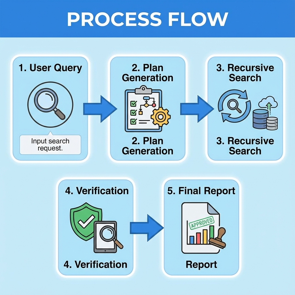 The user simply types a request like 'Research the impact of solid-state batteries on EV pricing'. The system then:\n1. Breaks the query into sub-questions.\n2. Executes parallel searches.\n3. Reads and summarizes top hits.\n4. Verifies overlapping facts.\n5. Generates a final, cited report.