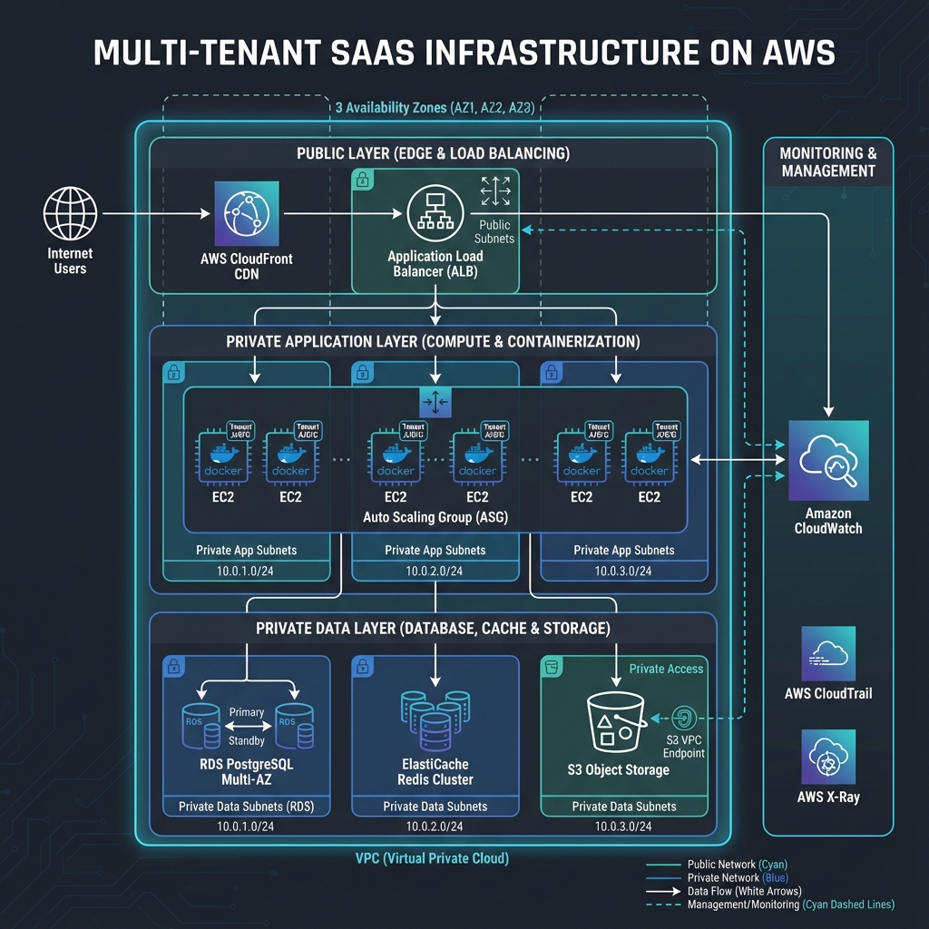 How we architected and automated cloud infrastructure for a multi-tenant SaaS platform serving 10K+ users across 500+ organizations, implementing automated scaling, deployment orchestration, comprehensive monitoring, and tenant isolation while reducing infrastructure costs by 40% through intelligent resource optimization.