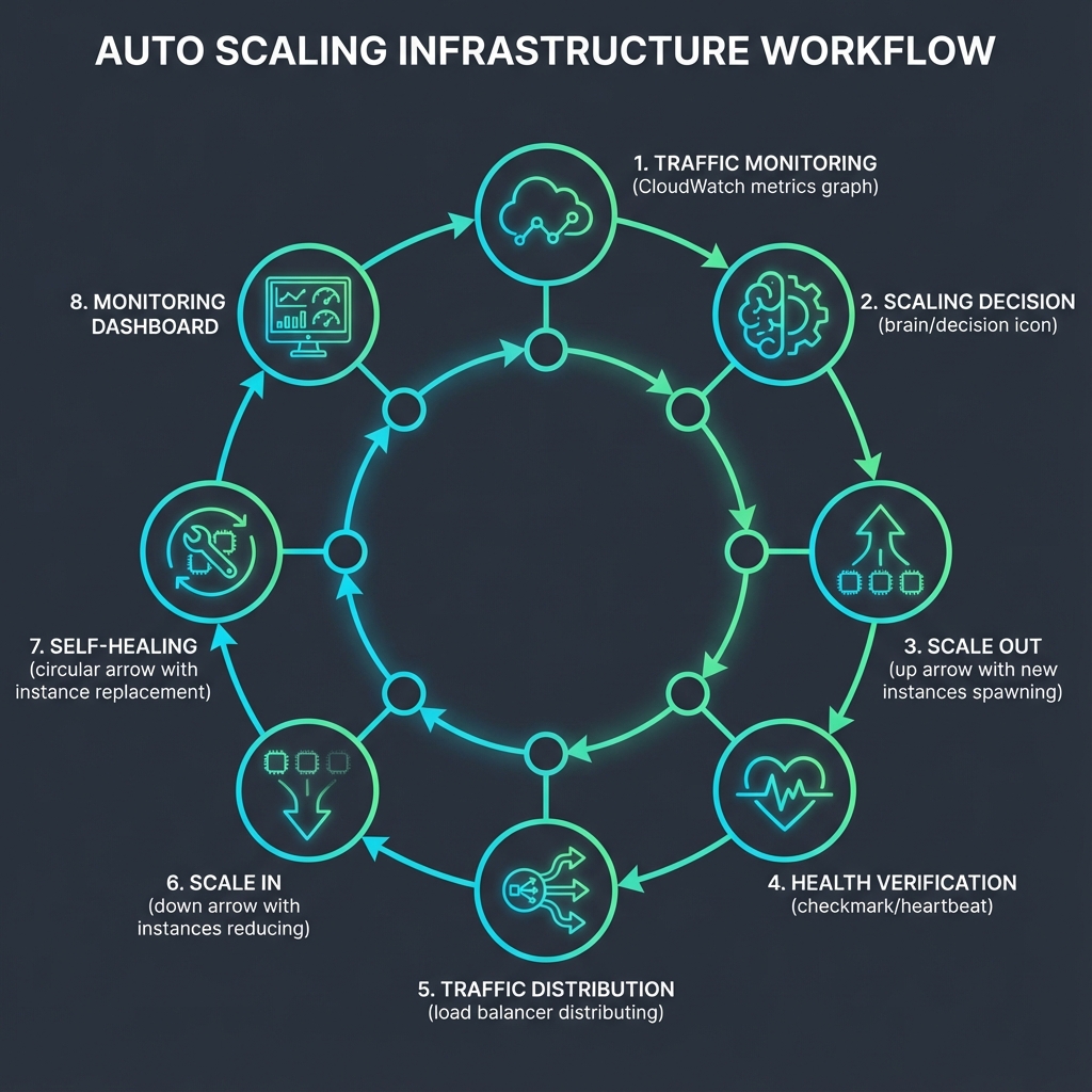 Scaling Decision: Auto Scaling policies evaluate metrics against thresholds (CPU > 70%, memory > 80%, request latency > 500ms).