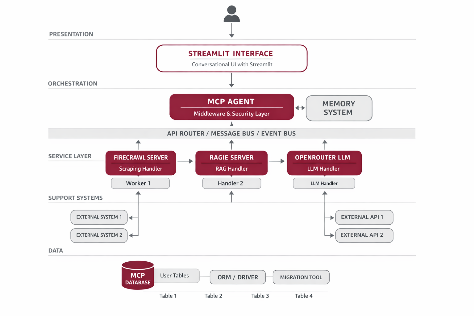 The system follows a modular architecture where a central MCP Agent orchestrates multiple specialized MCP servers. The Streamlit frontend provides the user interface, which communicates with an MCPAgent that manages tool selection and execution. Each MCP server (Firecrawl, Ragie) runs as an independent process, communicating via the standardized Model Context Protocol.