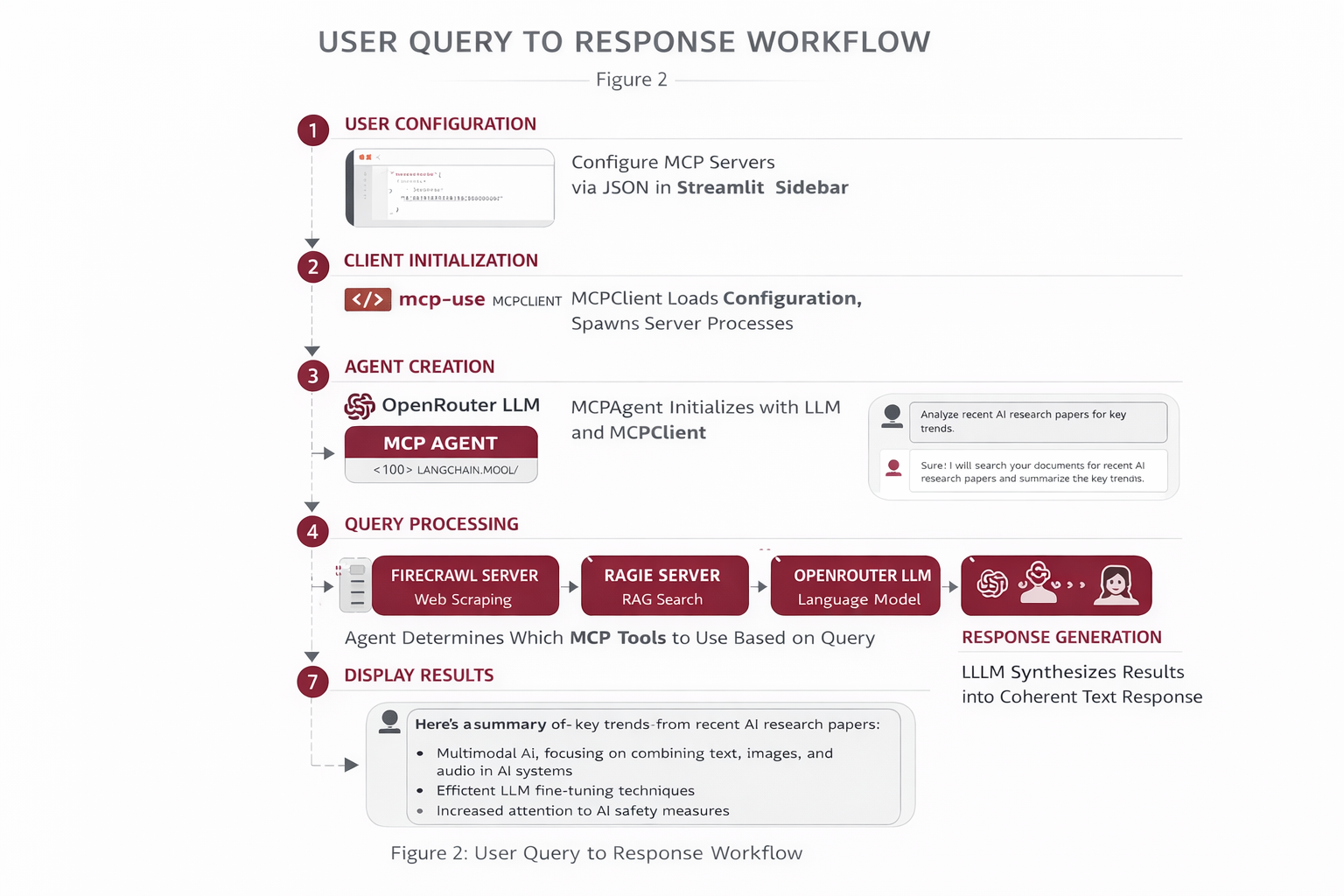 Step 1 - User Configuration: Users provide MCP server configurations via JSON in the Streamlit sidebar.\n\nStep 2 - Client Initialization: MCPClient loads and validates the configuration, spawning MCP server processes.\n\nStep 3 - Agent Creation: MCPAgent is initialized with the LLM and MCP client.\n\nStep 4 - Query Processing: User queries are sent to the agent, which determines which MCP tools to use.\n\nStep 5 - Tool Execution: The agent calls appropriate MCP servers (Firecrawl for web scraping, Ragie for RAG).\n\nStep 6 - Response Generation: Results from MCP tools are synthesized by the LLM into a coherent response.\n\nStep 7 - Display Results: The final answer is displayed in the Streamlit chat interface.