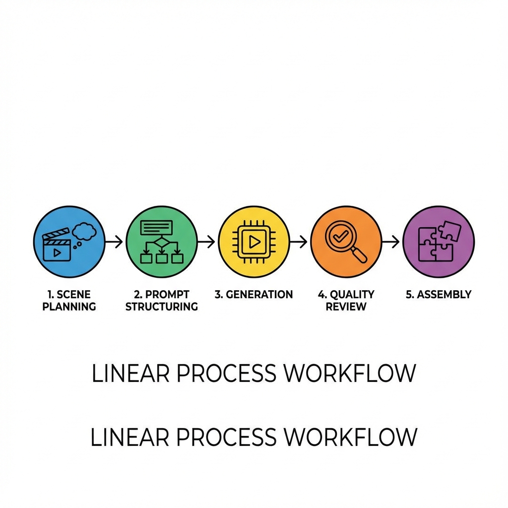 Scene Planning: Break the narrative into clear visual scenes.\n2. Prompt Structuring: Define camera motion, environment, and mood.\n3. Video Generation: Generate clips using Veo 3.\n4. Quality Review: Validate motion consistency and realism.\n5. Final Assembly: Stitch scenes with minimal post-processing.